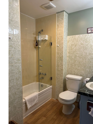 The main floor bathroom is equipped with a shower and a small bath suitable for children